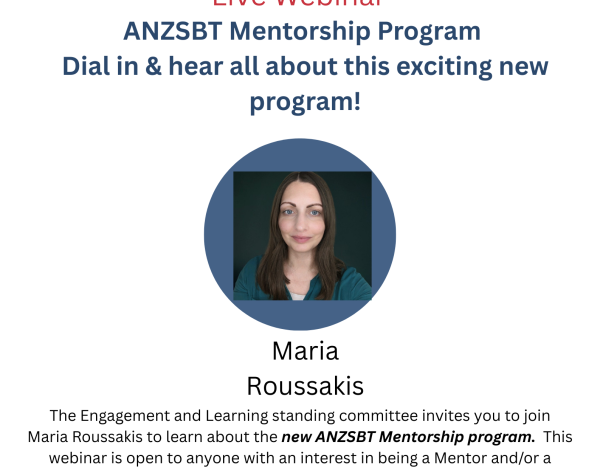 The Engagement and Learning standing committee invites you to join Maria Roussakis to learn about the new ANZSBT Mentorship program. This webinar is open to anyone with an interest in being a Mentor and/or a Mentee
