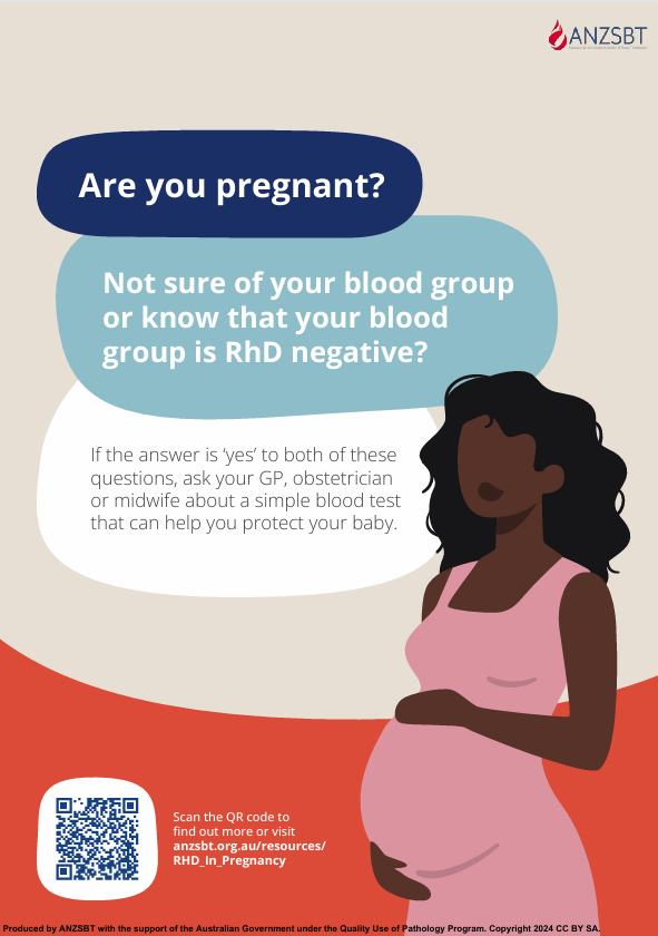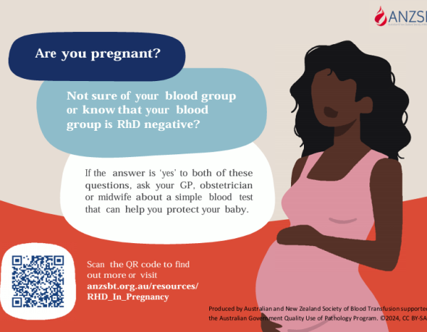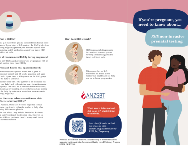 Non-Invasive Prenatal Testing (NIPT) for RHD may be used to determine whether an RhD negative woman carries an RhD positive fetus and threrefore requires RhD immunoglobulin prophylaxis. These were developed by ANZSBT and collaborators with the support of Australian Government Department of Health Quality Use of Pathology Program. Resources are free to use and adapt to local requirements with acknowledgement of the source.